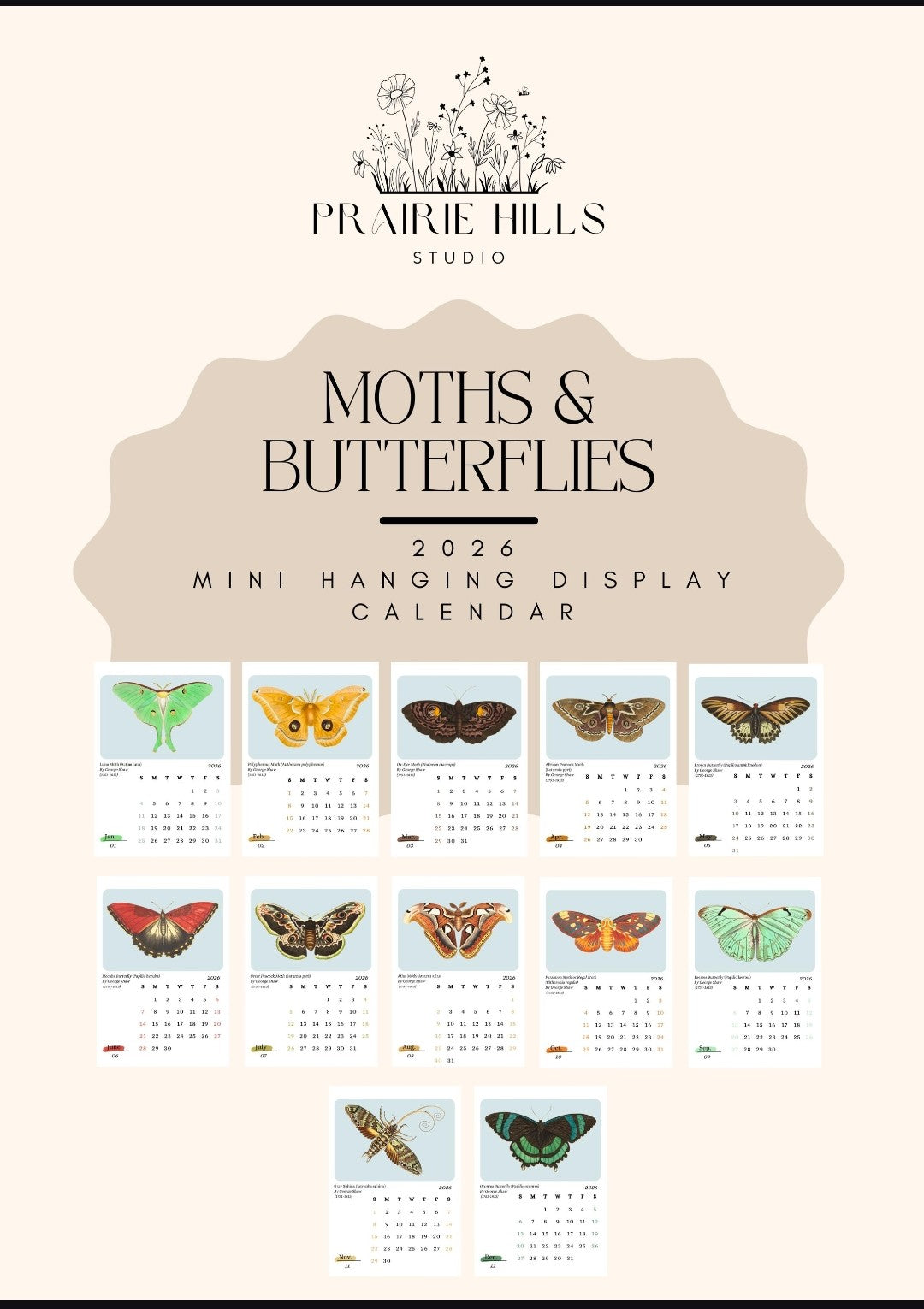 Each month displays a different moth or butterfly, printed on high-quality matte cardstock for a premium finish. The calendar comes ready to hang with twine. Its mini size makes it ideal for home, office, or gifting to insect lovers.