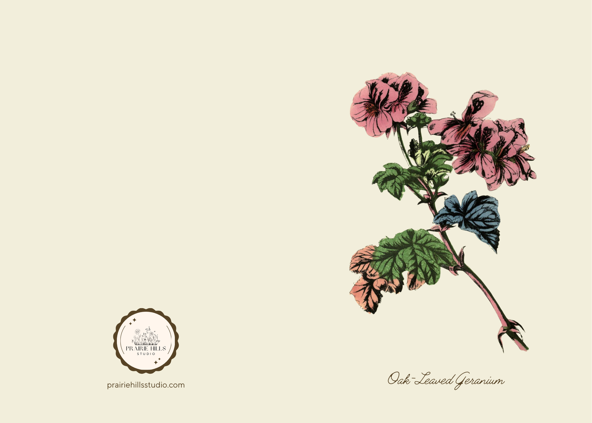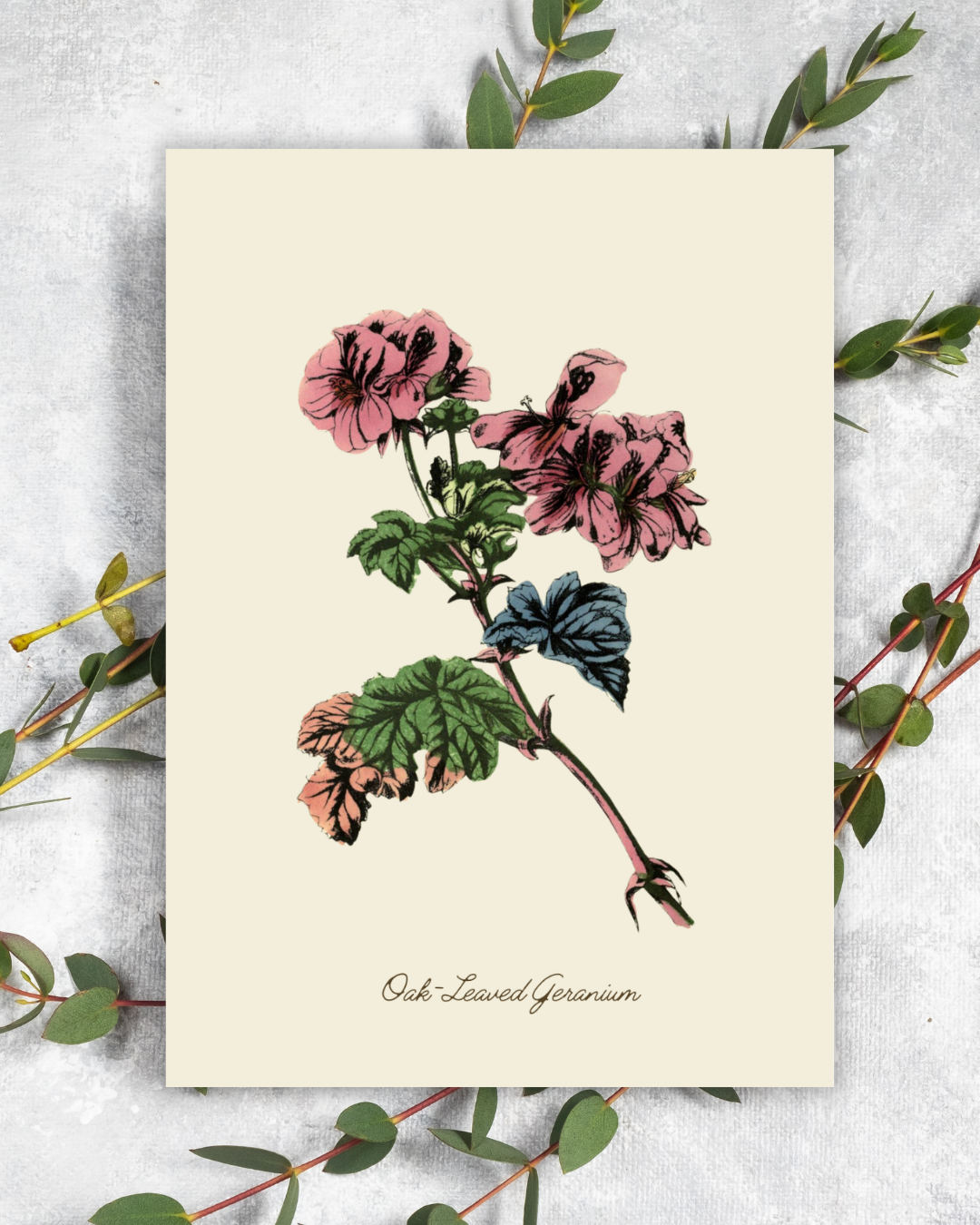 Individual Oak-Leaved Geranium handmade greeting card from the "The Language of Flowers" greeting card set. Featuring a strawberry illustration and its associated meaning ("True Friendship") according to the Victorian tradition, "Language of Flowers".