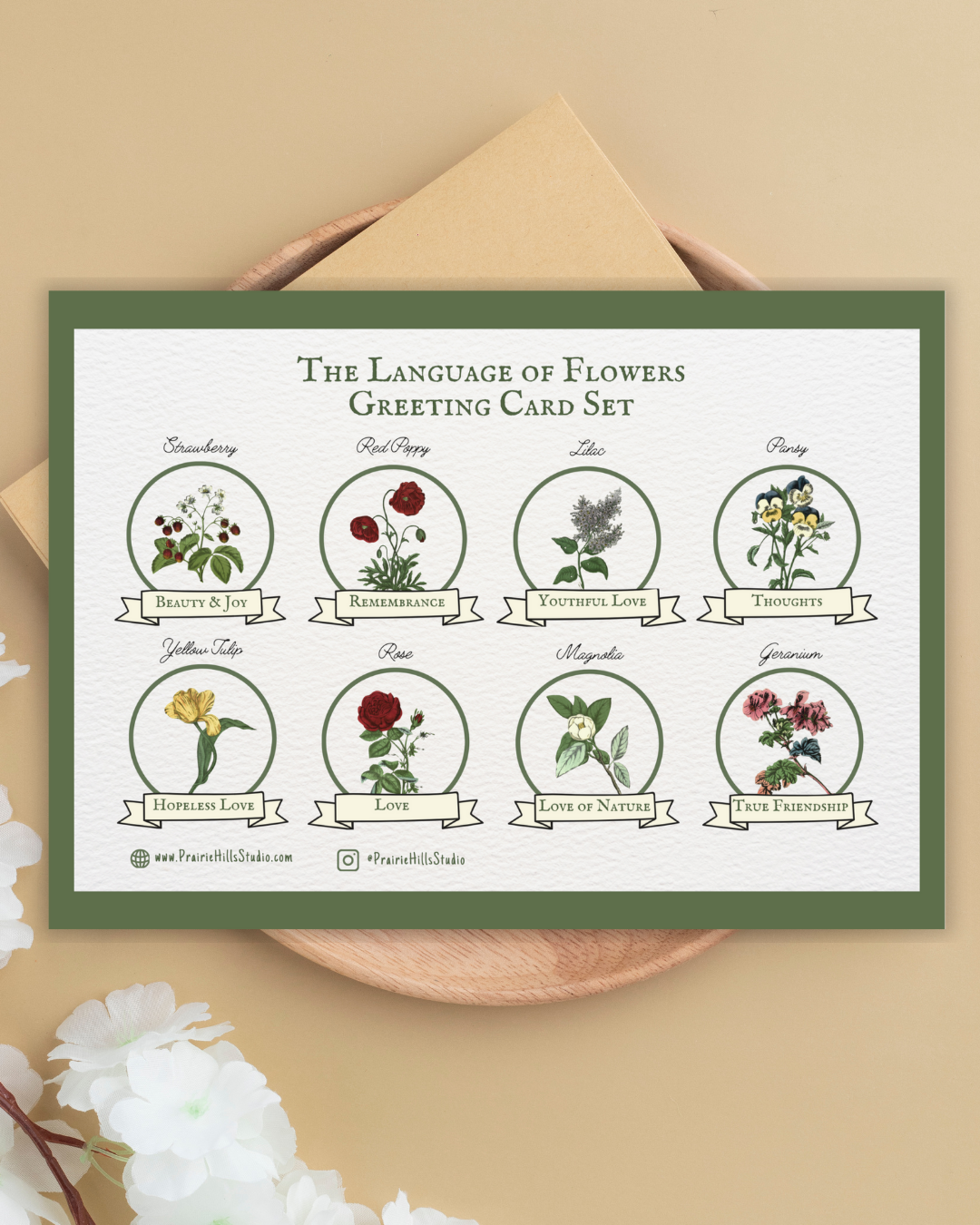 Handmade "The Language of Flowers" greeting card set. Featuring 8 different floral plant designs and their meaning according to the Victorian tradition, "Language of Flowers".